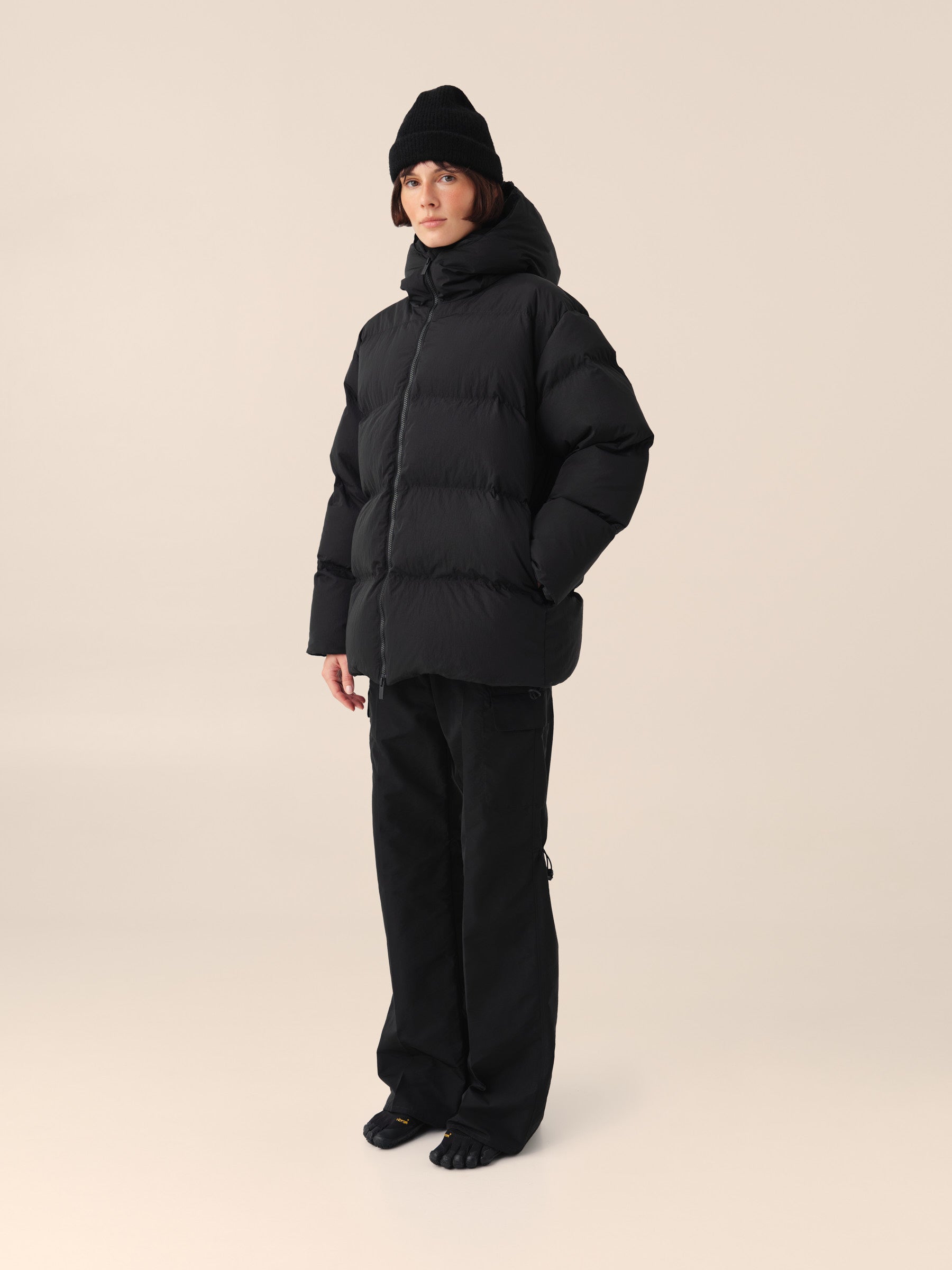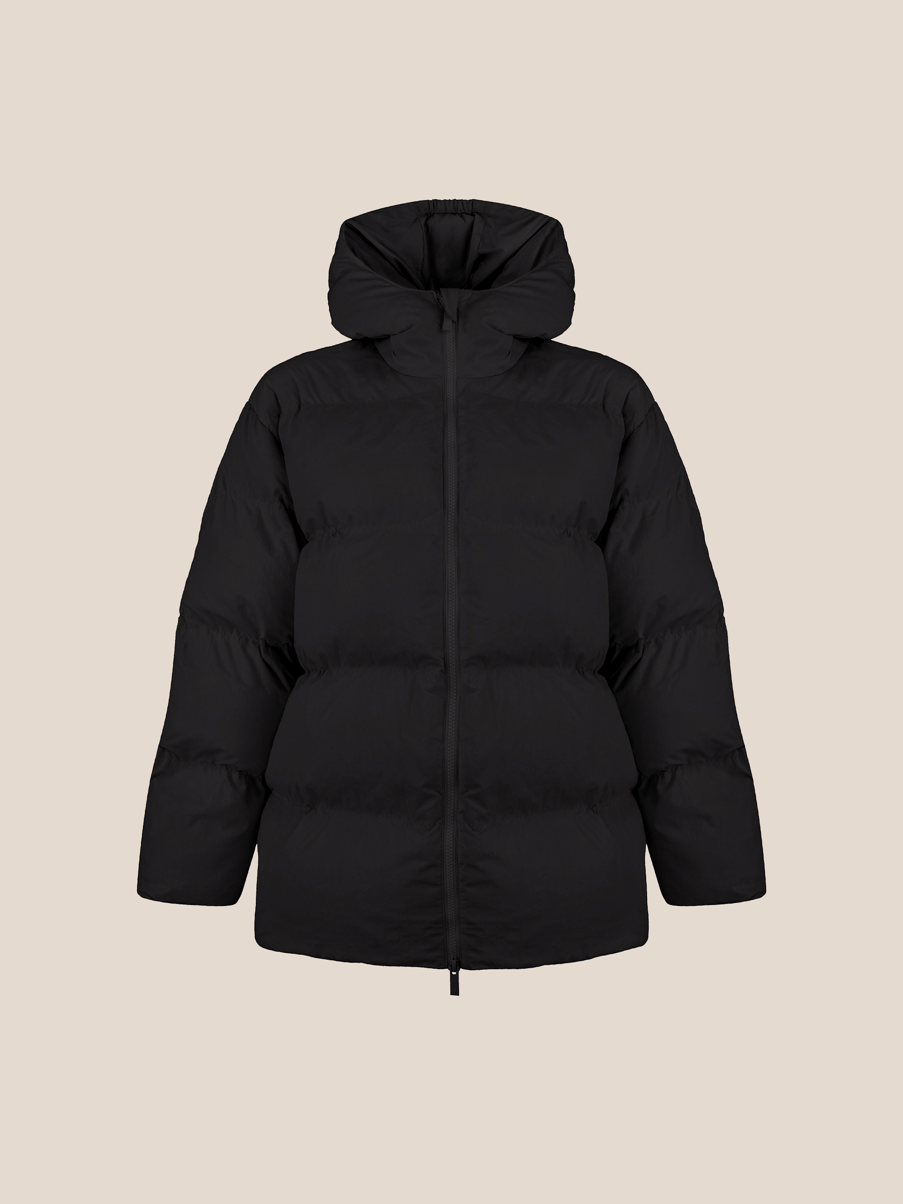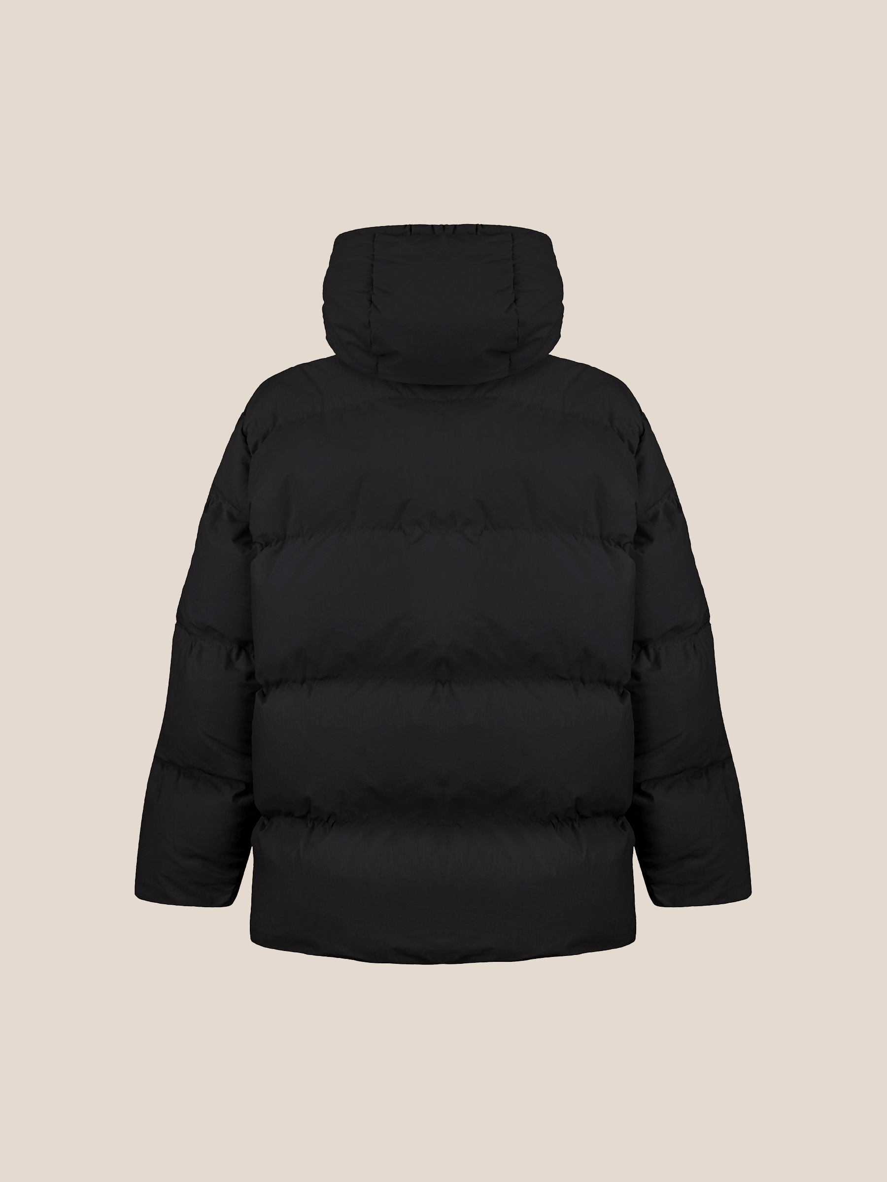 A high collar provides reliable protection from wind and cold, while the full-length zipper ensures ease of wear. Side zip pockets add practicality without compromising the jacket’s clean, minimalist aesthetic.