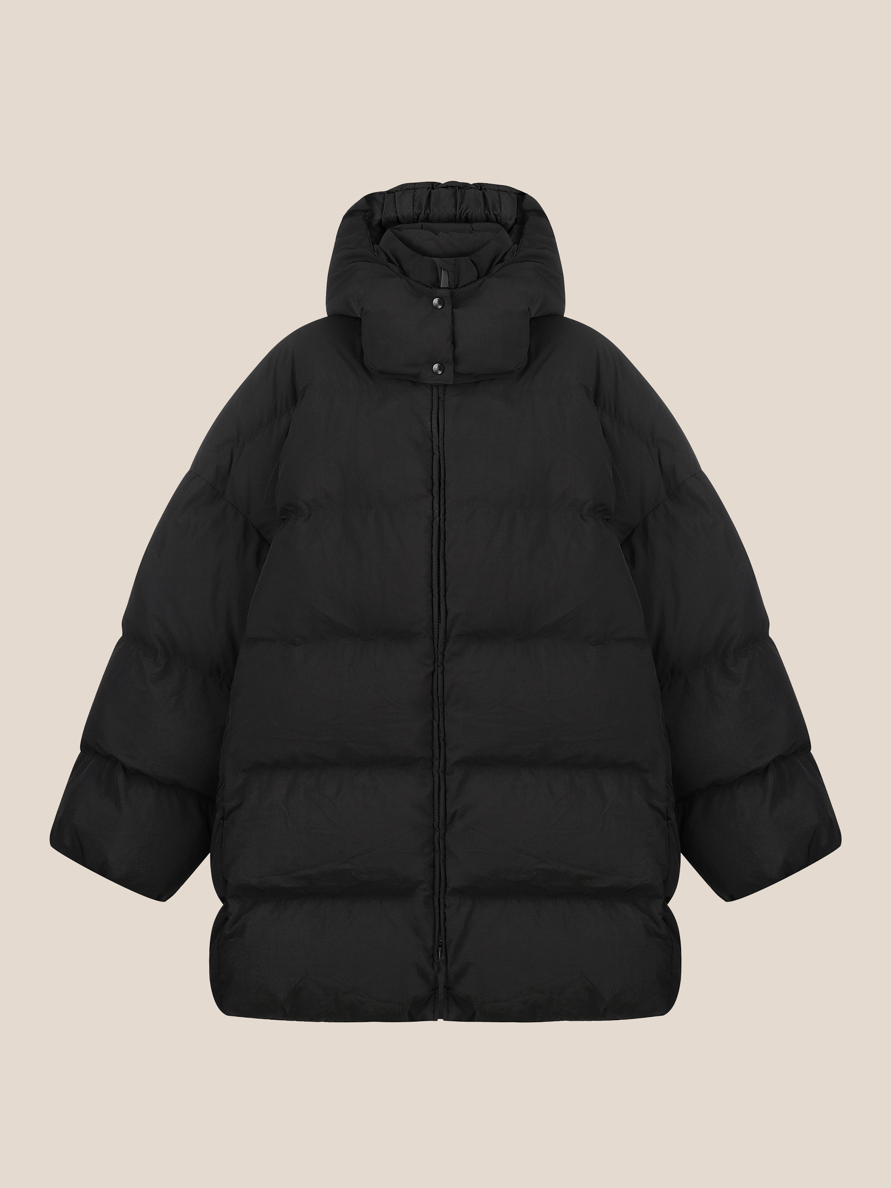 The puffer jacket is crafted in a versatile oversized silhouette. Bold horizontal quilting creates a distinctive textured pattern, while the extended length offers reliable protection against the cold.