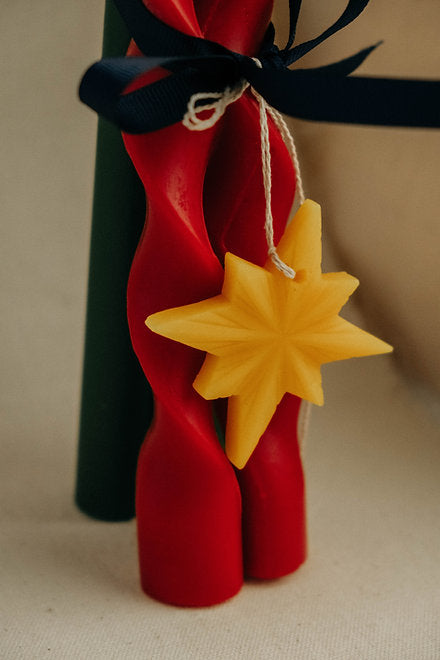 Embrace timeless holiday tradition with this expertly crafted beeswax candle collection. The verdant and crimson palette carries profound symbolism—green representing renewal and vitality, red embodying passion and devotion. Hand-poured entirely from pure beeswax, this curated set features two tapered pillars measuring 28 cm alongside two geometric pyramid forms at 24 cm, complemented by an elegant star accent piece. Each candle's artisanal creation ensures natural variation in dimensions up to 1 cm, a hallmark of authentic handcrafted quality.