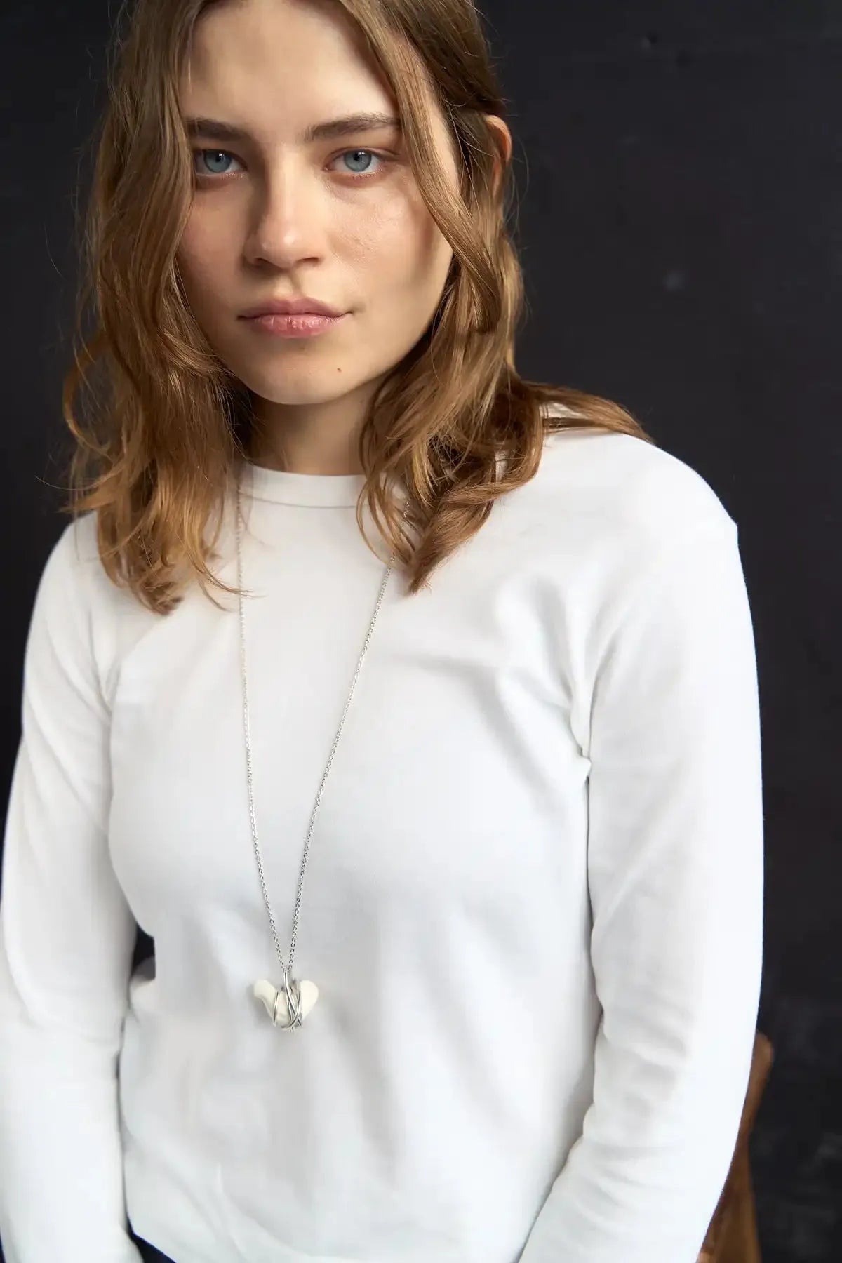 A pendant on a chain from the Liuli collection in the shape of a hen in a metal frame. The collection recreates images of animals from mother’s lullabies, which were endowed with symbolic protection. In the same way, the jewelry becomes a special talisman for its owner. The piece is made of porcelain. Each form is handcrafted, so it may differ from the one shown in the photo.